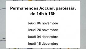 Les permanences de l'accueil paroissial auront lieu seulement les 1er et 3ème jeudis de chaque mois. Pour cette fin d'année 2025